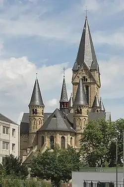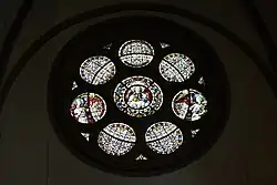Querhäuser ragen über die Seitenschiffwände hinaus. Strebepfeiler sichern die Querhäuser an den Ecken, die das Gewicht des Gewölbes und des Dachs tragen. Im Giebel werden die Häuser von einem gestuften Rundbogenfries geziert, während die Querschiffstirnwände mit jeweils einer Abstraktion einer Blütenform, einer Fensterrose aus zusammengesetzten Fastenbildern, ausgeschmückt wurden.[3]