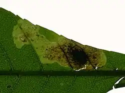 Aus den Eiern schlüpfen nach etwa 4 bis 21 Tagen die Eiraupen, die sich direkt unter der Eihülle unter die Blattepidermis fressen. Insgesamt werden sechs, selten sieben Larvenstadien bis zur Verpuppung durchlaufen. Die Larvalphase unterteilt sich in ein Fressstadium (vier bis fünf Stadien, L1 bis L4/L5) und ein Spinnstadium (zwei Stadien, S1, S2). Die Junglarven (L1) fressen sich zunächst einen Gang von ein bis zwei mm Länge strichförmig parallel zu einer Blattader im Blatt, den sie dann seitlich weiterführen. Die obere und untere Epidermis des Blattes bleibt dabei intakt, sie „minieren“ oder bilden eine Blattmine. L1-Raupe saugt eher Säfte als dass sie Zellgewebe frisst. Ab dem zweiten Larvenstadium (L2)[17] fressen sie dann das Palisadenparenchym, jedoch ohne die Blattadern, die weitgehend intakt bleiben. Die Larven trennen bei ihrer Fraßtätigkeit die Blattoberhaut von dem darunter liegenden Blattgewebe und trennen damit die Wasserversorgung ab, wodurch die Bereiche oberhalb der Minen austrocknen und braun werden.[11][18] Die L2 erweitert die Mine zu einem kreisförmigen Gebilde von 2 bis 3 mm, die L3 auf einen Durchmesser von 5 bis 8 mm. Die nun unregelmäßig zwischen zwei Blattadern erweiterten Minen können bis zum Ende des Fressstadiums 30 bis 40 mm groß werden. Bei starkem Befall können auch so genannte Gemeinschaftsminen entstehen, in denen sich mehrere Larven entwickeln.