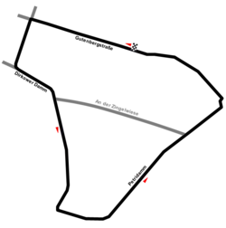 Die Rennstrecke war ein 4,6247 Kilometer langer Rundkurs[2] im Osten der Stadt, nahe der Unterwarnow in den heutigen Ortsteilen Dierkow-Ost und Brinckmansdorf. Die Strecke führte über Gutenbergstraße, Hinrichsdorfer Straße, Dierkower Damm und Petridamm. Fahrerlager, Boxen, Start und Ziel befanden sich in der Gutenbergstraße an der Schule.