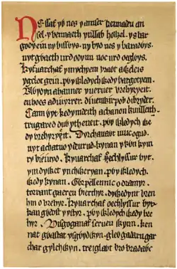 Der erste Teil des Manuskripts enthält Prosa, darunter das Mabinogion, Erzählungen, historische Texte (einschließlich einer walisischen Übersetzung von Geoffrey von Monmouths Historia Regum Britanniae, Brut y Brenhinedd), sowie eine Reihe von Strophen aus den Trioedd Ynys Prydein („Die Triaden der Insel Britannien“). Die Arthur-Tradition ist durch die späte Erzählung Breuddwyd Rhonabwy („Rhonabwys Traum“) und einige Merlin-Nachträge vertreten.