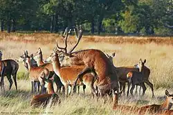 Die Paarungszeit beginnt in Mitteleuropa Anfang September und dauert fünf bis sechs Wochen. Im Alpenhochland sowie in Schottland setzt die Brunft dagegen erst im Oktober ein.[56] Schon gegen Ende August trennen sich die älteren männlichen Rothirsche von den Rudeln und suchen die Gruppen der weiblichen Tiere auf. Ausschlaggebend dafür ist der Hormonzyklus, der ältere Individuen zuerst brunftbereit werden lässt. Auf der Wanderung zu den Brunftterritorien legen die Tiere mitunter größere Strecken zurück. Belegt ist die Wanderung eines Männchens über eine Strecke von 120 Kilometern.[57] Das Brunftterritorium (auch Brunftplatz genannt) ist meist eine bevorzugte ebene Äsungsstelle des Weibchenrudels wie etwa eine Waldlichtung.