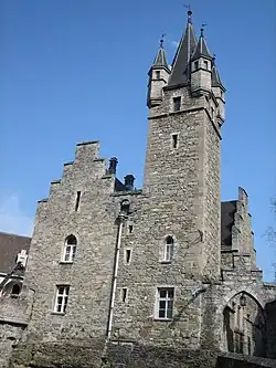 Der auffälligste Teil des Gebäudes ist der 9-stöckige, 33 m hohe[2], aus der zweiten Hälfte des 14. Jahrhunderts stammende Bergfried mit auffallendem Umgang im Bereich der Wehrplattform. Aufgesetzt auf das zinnenbekrönte oberste Stockwerk ist ein 2006 errichteter, 9 Meter hoher, verjüngter, quaderförmiger Glasaufbau, der effektvoll beleuchtet werden kann.