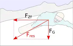 - eine Kraft, die immer dann berücksichtigt werden muss, wenn man die Bewegung eines Körpers bezüglich eines rotierenden Bezugssystems beschreibt.[3] Sie ergibt sich aus der Zentrifugalbeschleunigung durch Multiplikation mit der Masse. Diese Trägheitskraft ist abhängig vom Ort und der Winkelgeschwindigkeit des Bezugssystems. Sie tritt auch bei Abwesenheit einer Zentripetalkraft auf, jedoch nie in einem Inertialsystem.