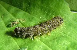 Die Raupen werden etwa 27 Millimeter lang. Sie haben eine dunkelgraue Grundfärbung und sind gelblich-weiß marmoriert. Auf jedem Segment befinden sich sechs rot gefärbte Punktwarzen, aus denen Haarbüschel wachsen. Auf der schwarzen Kopfkapsel sind zwei schräge, weiße Streifen auffällig.