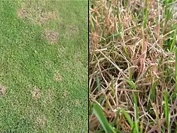 Erste Anzeichen sind unregelmäßig geformte Flecken mit teilweise abgestorbenen Gräsern, wobei der obere Teil des Halms bereits rötlich gefärbt ist. Im weiteren Verlauf zeigt sich ein watteartiges rosafarbenes Myzel, das sich zu einem roten, geweihartigen Pilzgewebe entwickelt und die Blätter verklebt.