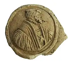 Auffällig ist eine nach links gewandte, bezopfte Büste auf einer weiteren Matrize. Das Gewand bauscht sich; ein Bäffchen weist ihn ebenso wie das Brustkreuz als Bischof in Amtstracht aus. Der Orden auf seiner Brust könnte eine Auszeichnung der Malteser sein. Dargestellt ist der Fürstbischof Leopold Ernst Graf von Firmian von Passau, der 1763 – 1783 dieses Amt ausübte. Dieser „letzte Barockfürst“ war ein bedeutender Kirchenmann und trieb u. a. die Kolonisierung des Bayerischen Waldes voran. Wegen seiner zahlreichen Reformen im Bistum wurde er zum Kardinal erhoben. Mit ihm endet das Großbistum Passau: Nach seinem Tod wurden die Diözesen Linz und St. Pölten abgetrennt.