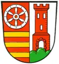 Blasonierung: Gespalten und vorne geteilt¸ oben in Rot ein sechsspeichiges silbernes Rad, unten fünfmal geteilt von Rot und Gold; hinten in Silber auf grünem Dreiberg ein roter Zinnturm.