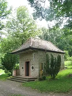Ein großes Holzrelief mit einer Mönchsszene vor der Kapelle erinnert an eine Einsiedelei, die es bis 1782 in der Nähe gegeben hat. Das Relief trägt die Inschrift: „In der lauten Welt schweigt Gott. Aber in der Stille kannst Du ihn hören“.