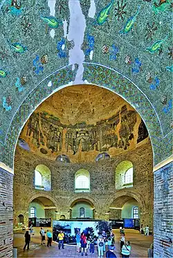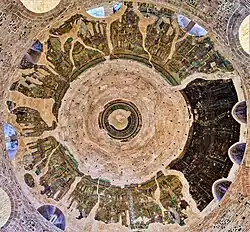 Die Mosaiken der Rotunde gelten als die ältesten Wandmosaiken des christlichen Ostens.[2] Zum Teil sind sie rein ornamental (Achtecke mit Vögeln und Fischen in der Südostnische, sich schneidende Kreise in der Westnische, teppichartig in der Südnische). Die Kuppelmosaiken auf Goldgrund sind in drei Zonen gegliedert: 15 erhaltene Märtyrerfiguren in weiten Gewändern (u. a. Ananias, Romanos, Aristarchos, Kyrillos, Basiliskos, Leon, Philipp, Priskos, Kosmas und Damian) vor sitzenden Pfauen[6] belebter Scheinarchitektur mit Akanthusblättern und Ornamentstreifen, fragmentarisch erhaltene Apostel und Engel und triumphierender Christus (nicht erhalten).