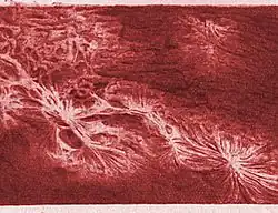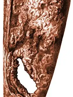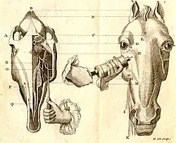 Zusätzlich können Anzeichen von Nasenrotz vorliegen, dieser kann sich in ein- oder beidseitigem Nasenausfluss oder Nasenbluten äußern. Rotzige Knötchen oder Geschwüre können fehlen oder erst sehr spät auftreten, sie finden sich am Nasenseptum und den Nasenmuscheln sowie am Kehlkopf und in der Luftröhre. Der Nasenausfluss ist grauweiß-schleimig bis graugelb-klebrig, er kann Blutbeimengungen und Schleimhautfetzen enthalten. Abgeheilte Veränderungen früherer Rotzschübe sind in der Regel in Form der typischen eisblumenförmigen „Rotznarben“ in der Nasenschleimhaut und in der Luftröhre zu finden. Hautrotz tritt nur in zehn Prozent der Fälle auf.[63] Häufig betroffene Stellen (Prädilektionsstellen) sind die Areale erhöhter mechanischer Belastung (Geschirrlage, Sattellage) an Kopf, Unterbauch, Brust und Hintergliedmaßen. In Haut und Unterhaut entstehen erbsen- bis walnussgroße Knötchen und Abszesse, die geschwürig zerfallen (Dermatitis malleosa ulcerosa), sich jedoch auch wieder zurückbilden können („fliegender Rotz“).[64] Aus eröffneten Herden fließt gelartiger gelblich-grauer Eiter (farcy oil) ab.