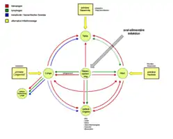 Die Ausbreitung des Erregers im Wirt ist mit der Tuberkulose vergleichbar. Im Regelfall stellt der Nasen-Rachen-Raum die Eintrittspforte („Entstehung des Primäraffekts“) dar. Über die ableitenden Lymphbahnen (lymphogen) erfolgt die anschließende Infektion des zuständigen regionären Lymphknotens („Bildung des Primärkomplexes“), in dem sich erste Rotz-Granulome bilden.[51] Über die Blutbahn (hämatogen) oder lymphogen erfolgt je nach Abwehrlage des Organismus die Ausbreitung in weitere Organe, vor allem in die Lunge.[52] Dort kommt es zur Bildung der für die Infektion typischen Rotzveränderungen. Die Infektion kann an diesem Punkt zum Stillstand kommen, oder es erfolgt die langsam fortschreitende (protrahierte) Abschwemmung des Erregers (Dissemination) in weitere Organe und Gewebe.[53] Erreicht der Erreger nach Infektion der Bronchien und Bronchioli den Hohlraum der luftleitenden Wege, so kann durch Hochhusten infektiösen Materials auf sekundärem Wege eine Kontaktinfektion der oberen Atemwege stattfinden (kanalikuläre Ausbreitung).[54] Bei einer Erregeraufnahme über Einatmen entsteht der primäre Nasenrotz, nach Eintritt über verletzte Haut der primäre Hautrotz.[55]