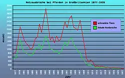 In den kriegsführenden Ländern waren die eigentlichen Seuchenspitzen jedoch regelmäßig erst nach Beendigung der bewaffneten Konflikte und Rückkehr der durchseuchten Tiere von der Front zu verzeichnen. Überflüssige Tiere aus Armeebeständen wurden oft ausgemustert und an die Zivilbevölkerung veräußert,[41] was die flächenhafte Ausbreitung der Infektion vor allem in den USA nach dem Amerikanischen Bürgerkrieg enorm förderte.[42] Der durch die Aushebung oder Tierverluste bedingte Mangel an Pferden wurde darüber hinaus auch durch Ankauf von Pferden aus anderen Gebieten gedeckt und begünstigte den Handel mit kranken oder minderwertigen Tieren.[43] Flüchtlingsströme aus den Ostgebieten trugen nach den beiden Weltkriegen maßgeblich zu lokalem Seuchenanstieg bei. Die Zerstörung veterinärbehördlicher Strukturen in besiegten Nationen führte zu verzögerter Bekämpfung des Rotzes.[44]