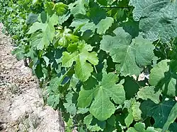 - Die großen und dicken Blätter sind fünflappig und tief gebuchtet. Die Stielbucht ist Lyren- förmig geschlossen. Das Blatt ist stumpf gezahnt. Die großen Zähne sind im Vergleich der Rebsorten weit gesetzt. Die Blattoberfläche (auch Spreite genannt) ist blasig derb.