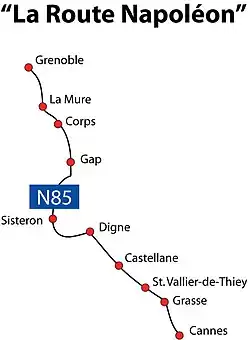 Als Route Napoléon wird die Straße in Frankreich bezeichnet, die der Marschroute folgt, die Napoleon I. (1769–1821) von Golfe-Juan (bei Antibes) über Grasse, Digne, Sisteron und Gap bis nach Grenoble zurücklegte, nachdem er, um die Macht zurückzuerobern, von Elba kommend in Südfrankreich gelandet war. Diese französische Nationalstraße Route nationale 85, auch RN 85, entstand 1927 und erhielt 1932 ihren Namen. Die Strecke mit einer Gesamtlänge von 335 Kilometern bewältigte Napoléons Truppe in einem siebentägigen Gewaltmarsch, zwischen dem 1. März 1815 und dem 7. März 1815. Die Straße ist durch Schilder mit kaiserlichen Adlern markiert, da der Marsch auch als „Adlerflug“ (Vol d’Aigle) bezeichnet wird, bezugnehmend auf Napoleons Ausspruch: „Der Nationaladler wird von Kirchturm zu Kirchturm fliegen bis zu den Türmen von Notre-Dame.“[1]