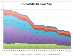 Mit Beginn der 2010er Jahre begann eine weitere Verkleinerungsaktion. Die drei bis 2014 ausgemusterten Flugzeugträger der Invincible-Klasse wurden durch zwei neue, größere Flugzeugträger der Queen-Elizabeth-Klasse ersetzt, die 2017 (Queen Elizabeth) und 2019 (Prince of Wales) in Dienst gestellt wurden. Zwischen 2009 und 2013 erfolgte ein Generationswechsel bei den Zerstörern, die Sheffield-Klasse (Type-42) wurde durch die modernere Daring-Klasse (Type-45) ersetzt.[5] Die Type-23-Fregatten werden ab Ende des Jahrzehnts durch solche der City-Klasse (Type 26) ersetzt. Das erste von aktuell (2012) 13 geplanten, mit einem CODLAG-Antrieb ausgerüsteten Schiffen soll 2021 in Dienst gestellt werden. Weitere ursprüngliche Planungen sind gemäß dem Weißbuch vom Oktober 2010, englisch Strategic Defence and Security Review (SDSR), zurückgestellt.