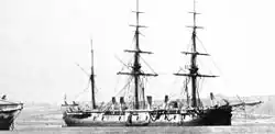 Die gesamte Seite des Schiffs, vom Oberdeck abwärts, war durch eine schmiedeeiserne Panzerung geschützt, die sich von mittschiffs 114 mm (4,5 Zoll) vorn und achtern auf 76 mm (3 Zoll) verjüngte. Die Panzerung reichte 1,7 m (5 Fuß 6 Zoll) unter die Wasserlinie und wurde von den 749 mm (29,5 Zoll) dicken hölzernen Seiten des Rumpfes gestützt.[13]