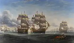 ![]() Die Royal Sovereign (links) im Gefecht mit der Santa Ana (rechts), während der Schlacht von Trafalgar