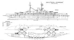 Das Schiff hatte eine Gesamtlänge von 189,20 m, eine Breite von 27 m und einen Tiefgang von 10 m. Die Verdrängung lag 1913 zwischen 28.000. t und 31.200 t[2] und nach seiner Umrüstung ab 1939 zwischen 32.066 t und 33.732 t.[12]