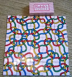 Rubik’s Tangle ist ein Puzzle von Ernő Rubik, das in den 1990er-Jahren erschien. Es besteht aus 25 quadratischen Teilen, die zu einem großen Quadrat aus 5×5 Teilen zusammengesetzt werden sollen. Es gibt Stellungsmöglichkeiten (25 Teile → , vier mögliche Orientierungen pro Teil → , je vier Puzzle sind identisch durch Rotation, je zwei sind identisch, da zwei Puzzleteile gleich sind). In der Praxis müssen viel weniger Kombinationen ausprobiert werden, da schon bei den ersten Teilen falsche Verbindungen auftreten können.