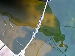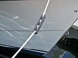 - Anlegefedern sind in der Dehnung beschränkte Federn aus Stahl oder Edelstahl. Setzt man sie zwischen einer an Land befestigten Kette und der Festmacherleine ein, ist die Leine zusätzlich vor Schamfilung geschützt. Ältere Metallfedern neigen jedoch zu lästigen Geräuschen.