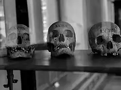 Als Rudolf-Virchow-Sammlung oder kurz „RV-Sammlung“[120] (alle Sammlungsstücke wurden mit „R.V.“ beschriftet) wird Virchows Sammlung von Schädeln und Skelettbestandteilen bezeichnet, die er ab etwa 1870[121] im Pathologischen Institut der Berliner Charité und später im Museum für Völkerkunde zusammentrug. Die Zahl der Objekte der Sammlung wird zwischen etwa 3500[120] und 4500[121] angegeben.