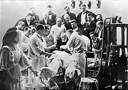 Neben den Vorlesungen und dem Mikroskopierkurs waren Sektionen ein Schwerpunkt der Tätigkeit Virchows. Außerdem war er für die pathologisch-anatomische Präparatesammlung zuständig, die sein Vorgänger Bernhard Mohr aufgebaut hatte.[24] Virchow führte in Würzburg als Prosektor fast 1000 Sektionen durch, obwohl er nicht dazu verpflichtet war, sondern nur ein Anrecht darauf hatte. Die meisten Leichen kamen aus dem Juliusspital, zusätzlich sezierte er Leichen auf dem Friedhof der Stadt. Meistens sezierte er den ganzen Körper, was damals nicht üblich war.[32] In den ersten drei Jahren sezierte Virchow allein, ab 1852 bewilligte man ihm einen Assistenten. Er hatte nacheinander vier Assistenten, die beiden letzten waren Friedrich Grohé (1854–1856) und Ernst Haeckel (Sommersemester 1856).[33] Virchow stellte in Würzburg wegweisende Postulate zur Sektionstechnik auf, die später in Preußen verbindlich gemacht wurden. Die drei wichtigsten Forderungen Virchows waren: Vollständigkeit der Sektion, standardisierte Reihenfolge und detailliertes Protokoll.[34][35]
