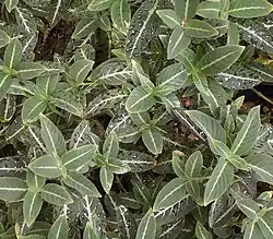Die gegenständig am Stängel angeordneten Laubblätter sind in Blattstiel und Blattspreite gegliedert. Die einfache Blattspreite ist bei einer Länge von 5 bis 7,5 Zentimetern elliptisch-eiförmig mit spitzem oberen Ende. Die Blattoberseite sind dunkelgrün, entlang der Mittelrippe und der Blattadern verläuft ein helles Band. Die Blattunterseite ist rot-violett.[1]
