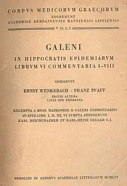 - Galens Kommentare zum 6. Buch der Epidemien des Hippokrates, Galeni in Hippocratis Epidemiarum librum VI commentaria I–VIII, herausgegeben von Ernst Wenkebach, übersetzt von Franz Pfaff, Berlin 1956, Seite 213, 289, 293, 347, 413, 476, 503; im CMG, Band V 10,2,2; online auf galen.bbaw.de der Berlin-Brandenburgische Akademie der Wissenschaften
