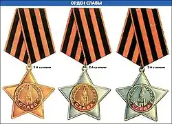 Der Ruhmesorden (russisch Орден Славы) wurde am 8. November 1943 vom Präsidium des Obersten Sowjets der Sowjetunion gestiftet. Der Orden hat drei Klassen und wurde nur an Soldaten bis zum Rang des Unteroffiziers verliehen. Die Verleihpraxis war, dass ein Soldat zuerst mit der rangniedrigsten dritten Klasse ausgezeichnet wurde, dann der zweiten und zum Schluss der höchsten, der ersten Klasse. Träger aller Klassen wurden „Ritter des Ruhmes-Ordens“, was zu den gleichen Privilegien wie ein „Held der Sowjetunion“ berechtigte. Das Band dieser Medaille ist das Sankt-Georgs-Band.