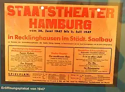 Die Stadt Recklinghausen und der Deutsche Gewerkschaftsbund gründeten die Gesellschaft zur Durchführung der Ruhrfestspiele und riefen die Ruhrfestspiele als jährliches Ereignis ins Leben. Die künstlerische Leitung hatte Karl Pempelfort 1947 bis 1951 inne.[5] Ihm folgte 1952 bis 1965 Otto Burrmeister. Das Programm war in den ersten Jahren von klassischem Theaterrepertoire wie Goethe, Schiller und Shakespeare und populären Opern wie Mozart, Wagner und Verdi geprägt. Die Opernaufführungen stellte man jedoch nach 1953 ein. Mit Wir sind noch einmal davongekommen von Thornton Wilder wurde 1952 zum ersten Mal Gegenwartstheater auf den Spielplan gesetzt, mit dem Gastspiel Herr Puntila und sein Knecht Matti der Städtischen Bühnen Frankfurt 1955 erstmals ein Stück von Bertolt Brecht.[6] In den folgenden Jahren wurde das Ereignis ständig erweitert, die Festspielzeit verlängert und um Konzerte, politische Veranstaltungen und Kunstausstellungen bereichert. Die jährlichen Kunstausstellungen wurden von Thomas Grochowiak konzipiert und geleitet.