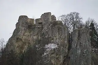 Die Burg wurde um 1080 von Graf Hartmann II. von Dillingen erbaut, im 12. und 13. Jahrhundert ausgebaut, nach 1282 erneuert und ab 1768 abgebrochen. Als weitere Besitzer werden die Grafen von Helfenstein sowie Österreich und Württemberg genannt. Von 1974 bis 1977 wurde die Ruine instand gesetzt. Eine erneute Sanierung erfolgte von 2017 bis 2021. Die ehemalige Burganlage zeigt noch gut erhaltene Reste eines Torturms an der Nordseite, Turmreste und Reste eines Donjons.