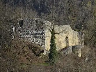 Von der ehemaligen Burganlage der kleinen Burg mit starker staufischer Schildmauer mit Buckelquader, was auf einen Umbau im 13. bis 14. Jahrhundert hinweist, sind noch Reste eines Steinhauses erhalten.