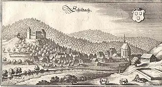 ![]() (Kupferstich von Matthäus Merian 1643) Burg Schiltach über der gleichnamigen Stadt | ||