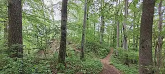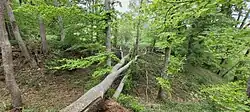 ![]() Blick auf die Spornburg und sichernden Halsgraben | ||