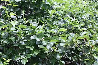 Die wechselständigen, einfachen Laubblätter haben einen dünnen, 1 bis 2 Zentimeter langen Stiel. Die Blattspreite ist 5 bis 13 Zentimeter lang und 3 bis 9 Zentimeter breit, meist breit-eiförmig bis verkehrt-eiförmig, seltener rundlich oder elliptisch, mit bespitzter bis zugespitzter Blattspitze, keilförmiger bis spitzer oder abgerundeter Basis und gesägtem bis gekerbtem Rand. Es werden drei bis fünf Nervenpaare gebildet. Beide Seiten sind blassgrün, die Blattoberseite ist kahl, die Unterseite kahl oder entlang der Blattadern spärlich behaart.[2][3] Es sind minimale und fadenförmige, gebüschelte Nebenblätter vorhanden.[4]