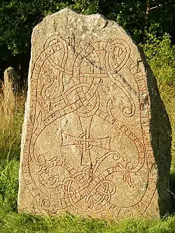 Der Runenstein aus rotem Granit zeigt ein feines Ornament mit zwei komplizierten Schlangenbändern. Die Inschrift beginnt am Kopf des Tieres, das nach links schaut, und setzt sich bis zu seinem Schwanz fort. Der zweite Teil der Inschrift beginnt am Schwanz des zweiten Tieres und endet am Kopf. Im Zentrum befindet sich ein als Salomonsknoten gestaltetes Ringkreuz.