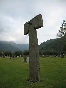 Das alte Steinkreuz von Grindheim (norwegisch Grindheimkrossen) wurde im Garten eines nahen Bauernhofes gefunden und an der Kirche aufgestellt. Das Kreuz stammt aus der Zeit um 1100 n. Chr., ist etwa zwei Meter hoch und hat glatte Seiten. Das abgebrochene Oberteil wurde nicht gefunden, so dass es nun die Form eines Taukreuzes hat.