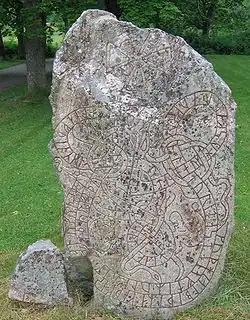 Der Text auf dem mit Tierdarstellungen und einem Kreuz verzierten Stein U 240 lautet: Dan und Huskarl und Sven und Holmfrid, Mutter und Söhne, errichteten diesen Stein in Erinnerung an Halvdan, den Vater von Dan und seinen Brüdern, und Holmfrid nach ihrem Ehemann.