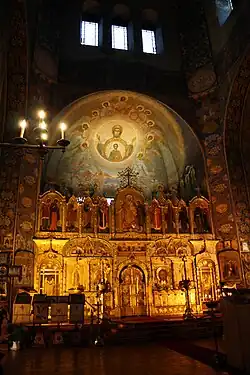 Die ursprünglich geplante Innenausmalung wurde letztendlich nicht umgesetzt.[22] Im Inneren finden sich allerdings wertvolle Holzschnitzereien, Fresken und Ikonen.[19] Die Ikonostase wurde von Léonide Pianovsky aus Moskau geschaffen, der im Jahr 1909 damit beauftragt wurde und sich vor allem mit den Ikonen von Jaroslawl beschäftigte. Sie ist 8,30 Meter lang und 6,90 Meter hoch. Von den 36 Ikonen, aus denen sie besteht, sind 26 auf Leinwand, acht auf Holz und zwei auf Metall aufgebracht. Verziert wird sie mit besticktem Seidenstoff, Leder und Edelsteinen. Abgebildet sind Jesus Christus, Maria, die vier Evangelisten, die heilige Alexandra, der heilige Nikolaus, die Erzengel Gabriel und Michael sowie weitere Heilige. Zudem gibt es Szenen aus dem Leben von Jesus und Maria sowie eine Darstellung der Verkündigung des Herrn.[23][24] Von Pianovsky stammen auch andere der zirka 300 weiteren Ikonen in der Kathedrale, etwa die große Muttergottesikone oder die große Peter-Ikone, die aus jeweils sieben Abbildungen zusammengesetzt wurden.[12][10][25][26]