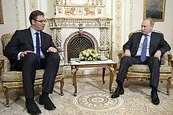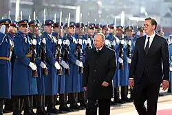 Nachdem Wladimir Putin Anfang 2000, Monate nach der Bombardierung Jugoslawiens durch die NATO, Präsident Russlands wurde, begannen die Beziehungen zwischen den beiden Ländern weiter an Dynamik zu gewinnen. Nach dem Sturz von Slobodan Milošević stattete der neue jugoslawische Präsident Vojislav Koštunica Putin im Oktober 2000 einen Besuch ab. In den 2000er Jahren behielt Serbien seine traditionell freundschaftlichen Beziehungen zu Russland bei, wobei es sich gleichzeitig der EU und der NATO annäherte. Nach der Unabhängigkeitserklärung des Kosovo 2008 verhinderte Russland mit seinem Veto im UN-Sicherheitsrat die internationale Anerkennung des Kosovos. Im Gegenzug schloss sich Serbien 2014 nicht den Sanktionen gegen Russland nach der Russischem Annexion der Krim an. In der Amtszeit von Aleksandar Vučić als Präsident Serbiens haben sich die Beziehungen zu Russland ab 2017 weiter vertieft. Vučić, ein ehemaliges Mitglied der ultranationalistischen Serbischen Radikale Partei und vormaliger Informationsminister unter Milošević, orientierte Serbiens außenpolitische Beziehungen hin zu China und Russland und weg vom Westen.[20][21] Im November 2019 wurden die Beziehungen allerdings belastet, als serbische Sicherheitsdienste Aktivitäten russischer Geheimdienstmitarbeiter aufdeckten, die sich mit serbischen Armeeangehörigen trafen und ihnen Geld übergaben.[22]