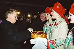 In den 1990er Jahren versuchte Präsident Leonid Kutschma eine ausgeglichene Außenpolitik zu verwirklichen. Er näherte die Ukraine an die NATO und die Europäische Union an, ohne die Beziehungen zu Russland zu vernachlässigen. Das Land litt allerdings unter einer wirtschaftlichen Krise und der sinkenden Industrieproduktion, welche durch den Verlust des einheitlichen Wirtschaftsraums verursacht wurde. Außerdem litt das Land an politischer Korruption und der Spaltung in einen prowestlichen Westen und einen prorussischen Osten, der in den meisten Wahlen andere politische Kandidaten unterstützte. Im März 1994 fand in der Autonomen Republik Krim ein Referendum statt, bei dem sich knapp 80 % der Wähler für eine stärkere Autonomie der Krim aussprachen.[21] Ähnliche Referenden fanden auch im Donbass statt.[22] Im Herbst 2004 kam es in der Ukraine zur Orangen Revolution der proeuropäischen Kräfte nach Unregelmäßigkeiten bei der Präsidentschaftswahl. Diese wurde von Russland unter dem 1999 ins Amt gekommenen Wladimir Putin mit Misstrauen betrachtet. Bei der wiederholten Präsidentschaftswahl gewann der prowestliche Wiktor Juschtschenko gegen den russlandfreundlichen Wiktor Janukowytsch. Juschtschenko war kurz vor seiner Wahl Opfer einer Dioxinvergiftung geworden, die er mit Spätfolgen überlebte. In einem späteren Interview antwortete Juschtschenko auf die Frage der BBC, ob der russische Präsident Putin involviert gewesen sei, er habe dazu eine Antwort, aber er werde sie nicht aussprechen.[23]