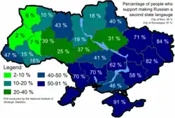 Die russische Sprache ist insbesondere im Süden und Osten des Landes verbreitet. Während die offizielle Volkszählung die Russischsprachigen nur in den Oblasten Luhansk und Donezk sowie auf der Krim in der Mehrheit sah, war dies unabhängigen Statistiken zufolge auch in weiteren Gebieten der Fall, speziell in den Oblasten Charkiw, Dnipropetrowsk, Odessa, Mykolajiw und Saporischschja.[3] Auch in Kiew war 2012 verschiedenen Statistiken zufolge die Mehrheit der Bevölkerung russischsprachig. Während die offizielle Volkszählung für Kiew nur rund 25 % russische Muttersprachler nannte, ergab die Statistik der Akademie der Wissenschaften, dass 41,2 % der Befragten sowohl Russisch als auch Ukrainisch im privaten Umfeld nutzen und 39,9 % sogar ausschließlich Russisch. Die Zahl derer, die dort nur Ukrainisch sprechen, lag nur bei rund 18 %.[2]
