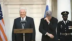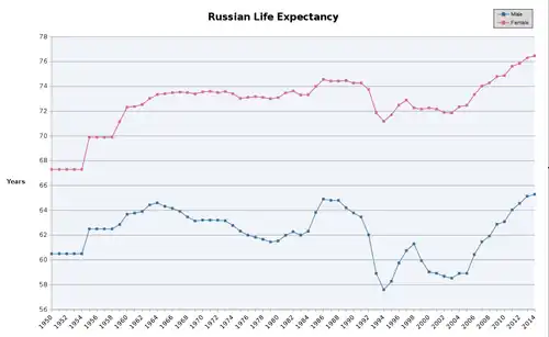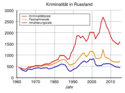 Die Russische Föderation ist „Fortsetzerstaat“[12] der Sowjetunion in internationalen Organisationen. Dem sowjetischen Bundesstaat voraus gingen das Russische Kaiserreich, das Zarentum Russland und ursprünglich das Großfürstentum Moskau, ein Teilfürstentum des früheren ostslawischen Reiches Kiewer Rus. Um 1990 endete der Kalte Krieg, Russland wurde zwischenzeitlich ein wenig demokratischer und näherte sich leicht „dem Westen“ an. Die damalige Verfassung sieht für Russland eine semipräsidentielle Demokratie vor, die Verfassungswirklichkeit entspricht gemäß Demokratie-Indizes heute jedoch der einer Autokratie,[13] bzw. einer „superpräsidentielle(n) Herrschaft“ oder Postdemokratie.[14][15] Korruption und Menschenrechtsverletzungen sind weit verbreitet.