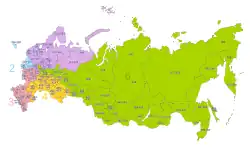 Russland ist in elf Zeitzonen eingeteilt (von UTC+2 bis UTC+12), wobei mit der Abschaffung der Zeitumstellung im Jahr 2011 bis 2014 überall ganzjährig die Sommerzeit galt. Nach anhaltender Kritik aus der Bevölkerung[18] kehrte Russland am 26. Oktober 2014 zur Normalzeit zurück.
