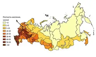 Die Bevölkerung ist innerhalb Russlands sehr ungleichmäßig verteilt. 85 % der Bevölkerung (etwa 123 Millionen Menschen) leben im europäischen Teil (23 % der Gesamtfläche) und 15 % (etwa 22 Millionen Menschen) im flächenmäßig weit größeren asiatischen Teil (77 % der Gesamtfläche). Die Bevölkerungsdichte variiert von 362 Einwohner/km² in der Hauptstadt und ihrer Umgebung (Gebiet Moskau) und unter 1 Einwohner/km² im Nordosten und im russischen Fernen Osten. Im Schnitt beträgt sie 8,3 Einwohner/km². Da in vielen Fällen ein beträchtlicher Bevölkerungsanteil im jeweiligen Gebietshauptort lebt, liegt die Bevölkerungsdichte im ländlichen Raum auch in den relativ dicht besiedelten zentralrussischen Verwaltungsgebieten selten höher als 40 bis 50 Einwohner/km².