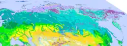 Die Jahresdurchschnittstemperatur für Russland wird mit −5,5 °C angegeben.[20] Große Teile des Landes sind vom Kontinentalklima mit heißen Sommern und sehr kalten Wintern geprägt. Je weiter man in Richtung Osten des Landes reist, desto deutlicher spürt man die prägenden Temperaturen zu den verschiedenen Jahreszeiten, das heißt, der Sommer ist extrem heiß und die Temperaturen in den Wintermonaten mitunter eisig kalt. Kaum ein anderes Land bietet solche Temperaturunterschiede wie Russland. Die südliche Hälfte des Fernen Ostens hat ein vom Monsun beeinflusstes Klima. Die durchschnittlichen Januartemperaturen liegen mit Ausnahme der Schwarzmeerküste überall unter dem Gefrierpunkt. In Ostsibirien sinken sie auf −35 bis −60 °C ab, sind aufgrund der meist sehr niedrigen Luftfeuchtigkeit jedoch leichter auszuhalten. Die Sommertemperaturen sind sehr unterschiedlich. Die Durchschnittstemperaturen im hohen Norden liegen bei +1 bis +2 °C, in den Halbsteppen und Steppengebieten des Südens hingegen bei +24 bis +25 °C.