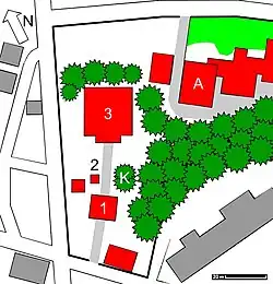 Weiter hinten rechts befindet sich das Abt- und Mönchsquartier (A).