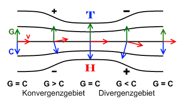 Im Gegensatz dazu erfolgt ein Massenfluss in Richtung des höheren Drucks, wenn sich ein Luftpaket in ein Divergenzgebiet bewegt. Die Anpassung der Windgeschwindigkeit an die örtlichen Bedingungen erfolgt durch die Trägheit wieder verzögert, somit verringert sich auch die Corioliskraft langsamer als die Gradientkraft, d. h. der Einfluss der Corioliskraft auf die Bewegung vergrößert sich. Die Massenverlagerung im Strömungsdelta ist im Vergleich zu den Vorgängen der Bewegung in ein Konvergenzgebiet größer, da die Anfangsgeschwindigkeit der Luft bei Bewegung in das Divergenzgebiet höher ist als beim Eintritt in das Konvergenzgebiet. Insgesamt findet somit ein Massengewinn in Richtung des höheren Drucks statt. Der daraus resultierende Anstieg des Luftdrucks führt zur Herausbildung eines dynamischen Hochdruckgebietes am Boden, auf der Gegenseite verringert sich durch den Massenverlust der Bodendruck und es entsteht ein dynamisches Tiefdruckgebiet.[1]