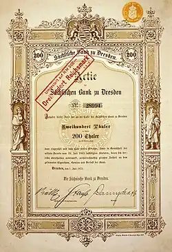 Mit der Reichsgründung 1871 verloren die Gliedstaaten des Reiches ihr Gesetzgebungsrecht im Bezug auf das Geldwesen. Die Reichsbank erhielt aber einerseits kein Monopol auf die Emission von Banknoten, die bestehenden Notenbanken behielten wiederum andererseits das Recht, Banknoten in einem Umfang herauszugeben, der in der Anlage zu § 9 des Bankgesetzes vom 14. März 1875 festgehalten war.[1] Nach dem Verzicht der Herausgabe solcher Banknoten durch die Leipziger Bank 1875, den der Chemnitzer Stadtbank 1890 und dem des Leipziger Kassenvereins 1890 war sie verbleibend die einzige Privatnotenbank Sachsens, die im ganzen Reich umlauffähige Banknoten herausgab. Ab 1888 bot sie ihren Kunden zudem den provisionsfreien Scheck- und Giro-Verkehr an.