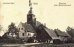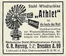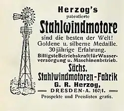 Das Aussehen der Kanonenbohrfabrik blieb weitgehend erhalten. Es wurde lediglich ein Modell einer Windturbine auf dem Turm installiert, in dem früher die senkrecht aufgehängten Kanonenrohre ausgebohrt wurden. Historische Abbildungen zeigen, dass zu verschiedenen Zeiten unterschiedliche Modelle auf dem Turm installiert waren.[2] Die Firma hieß laut dem Adressbuch Dresden ab mindestens 1913 „Sächsische Stahl-Windmotoren-Fabrik G. R. Herzog GmbH“.[4] Sie produzierte Windturbinen der Marken Ultra und Goliath sowie in Lizenz Turbinen nach dem System des US-Amerikaners Daniel Halladay (1826–1916) und kleinere Anlagen mit dem Eklipse-System zur Regelung.[5] Das System Ultra wurde für mittlere bis sehr große Windräder verwendet, die 18 bis 48 gewölbte verstellbare Rotorblätter aus verzinktem Blech besaßen und einen Durchmesser von 3,5 bis 18 m hatten.[5] Der Goliath-Motor besaß 18 feste Rotorblätter, die in drei Gruppen angeordnet waren, und hatten einen Durchmesser von 3 bis 6 m.[6] Nach 1910 kam auch noch die Marke Athlet hinzu mit festen Rotorblättern und Eklipse-Regelung.